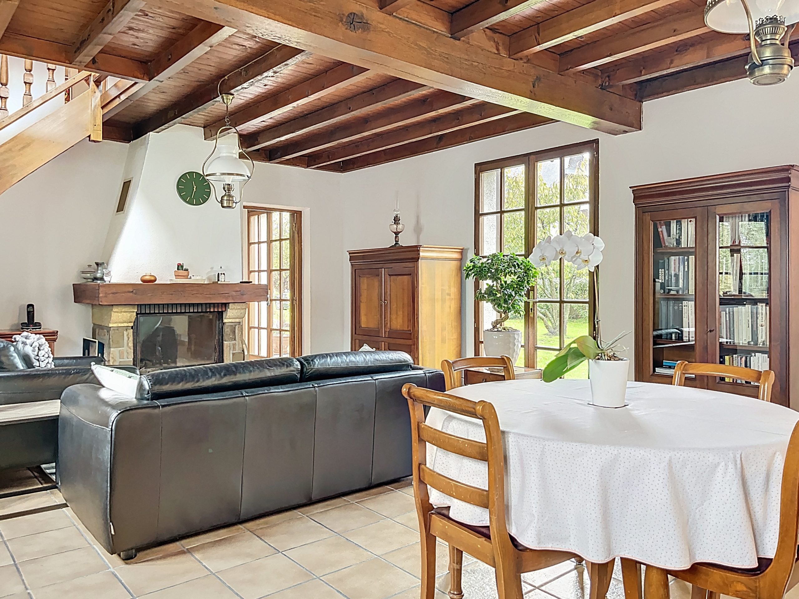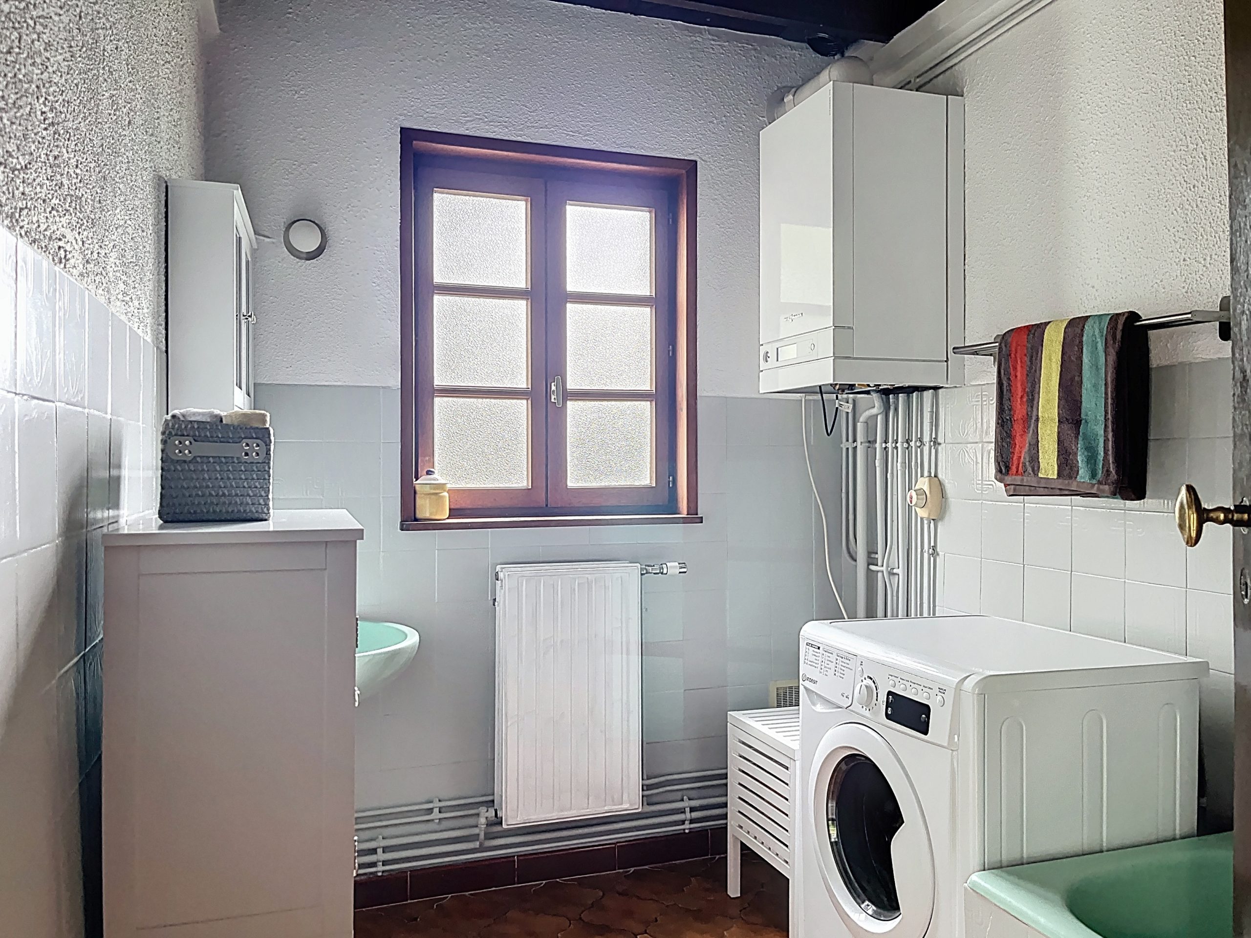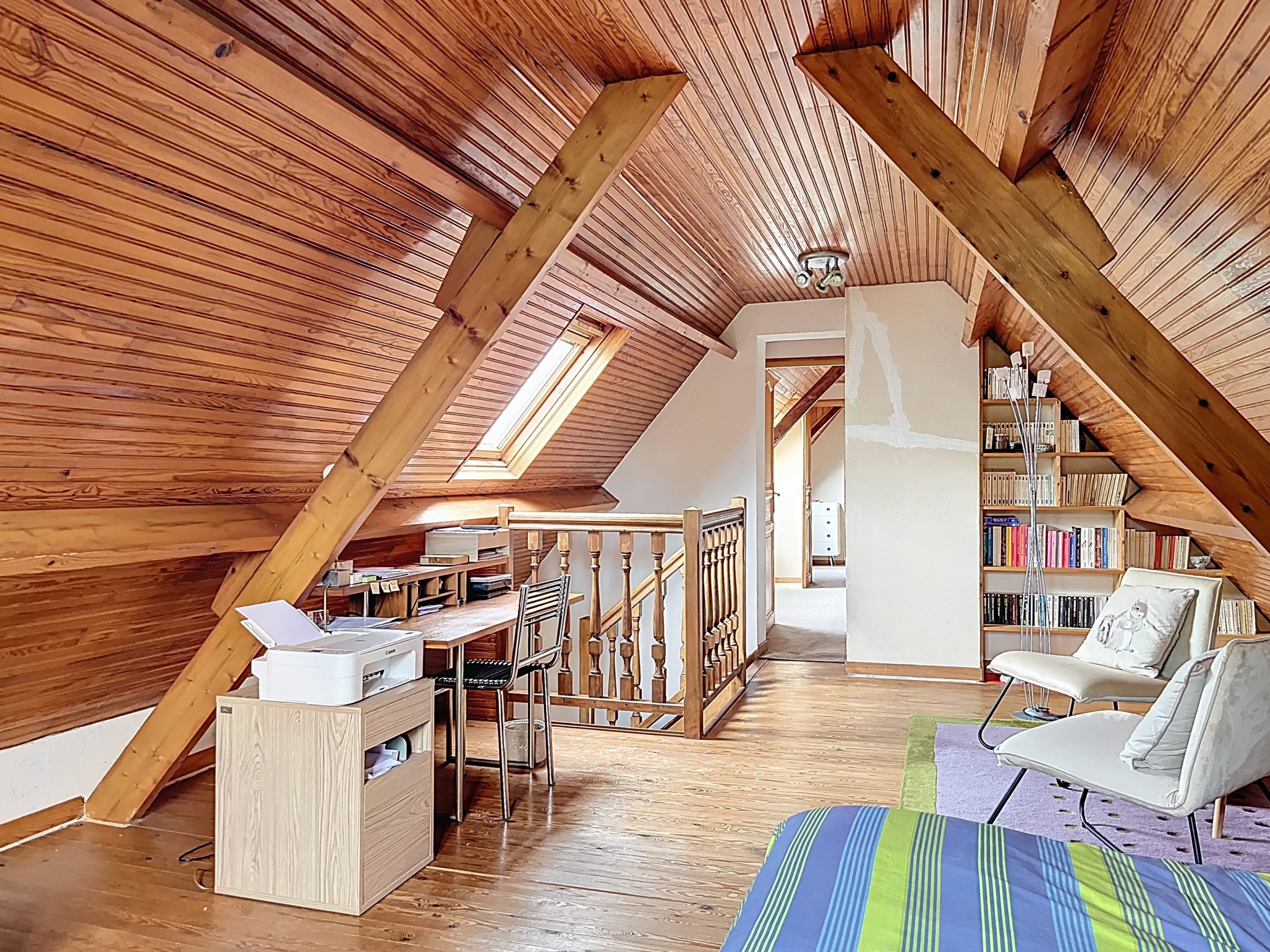 Au rez-de-chaussée, la maison offre de beaux volumes de vie: un salon cocoon agrémenté une belle cheminée avec foyer fermé et un vrai coin repas, une cuisine fonctionnelle et lumineuse, une chambre, une salle de bain, un WC et un bureau.